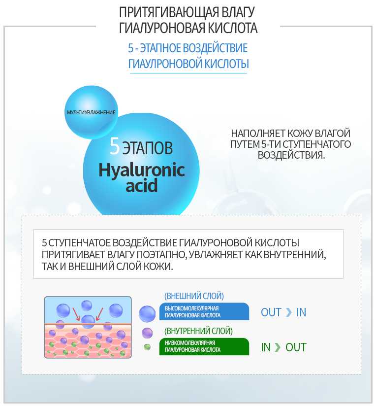 • Гиалуроновая кислота (Hyaluronic acid) - притягивающая влагу гиалуроновая кислота насыщает кожу влагой. Высокомолекулярная гиалуроновая кислота удерживает влагу во внешнем слое кожи. Низкомолекулярная гиалуроновая кислота насыщает влагой внутренние слои кожи.